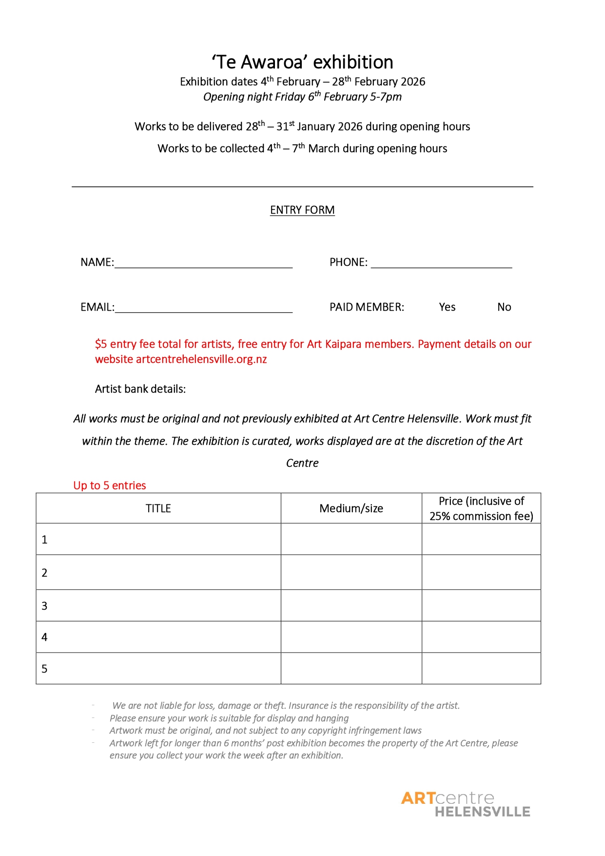 Our annual exhibition to enter with the theme of the Kiapara River, and our local landmarks Te Awaroa.